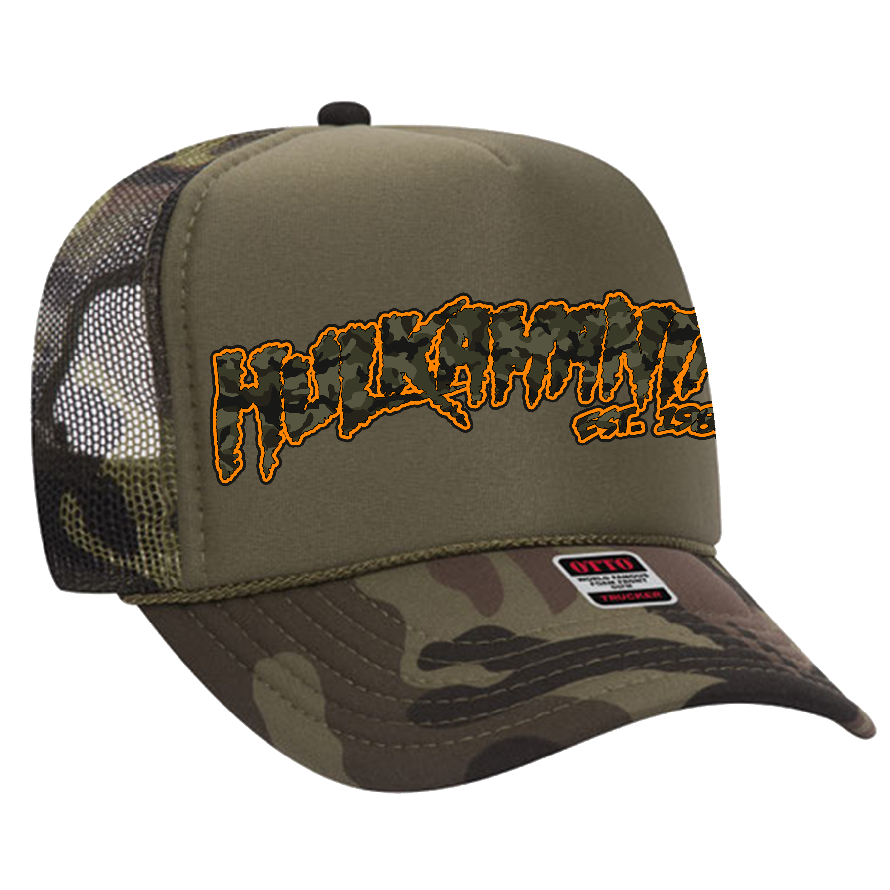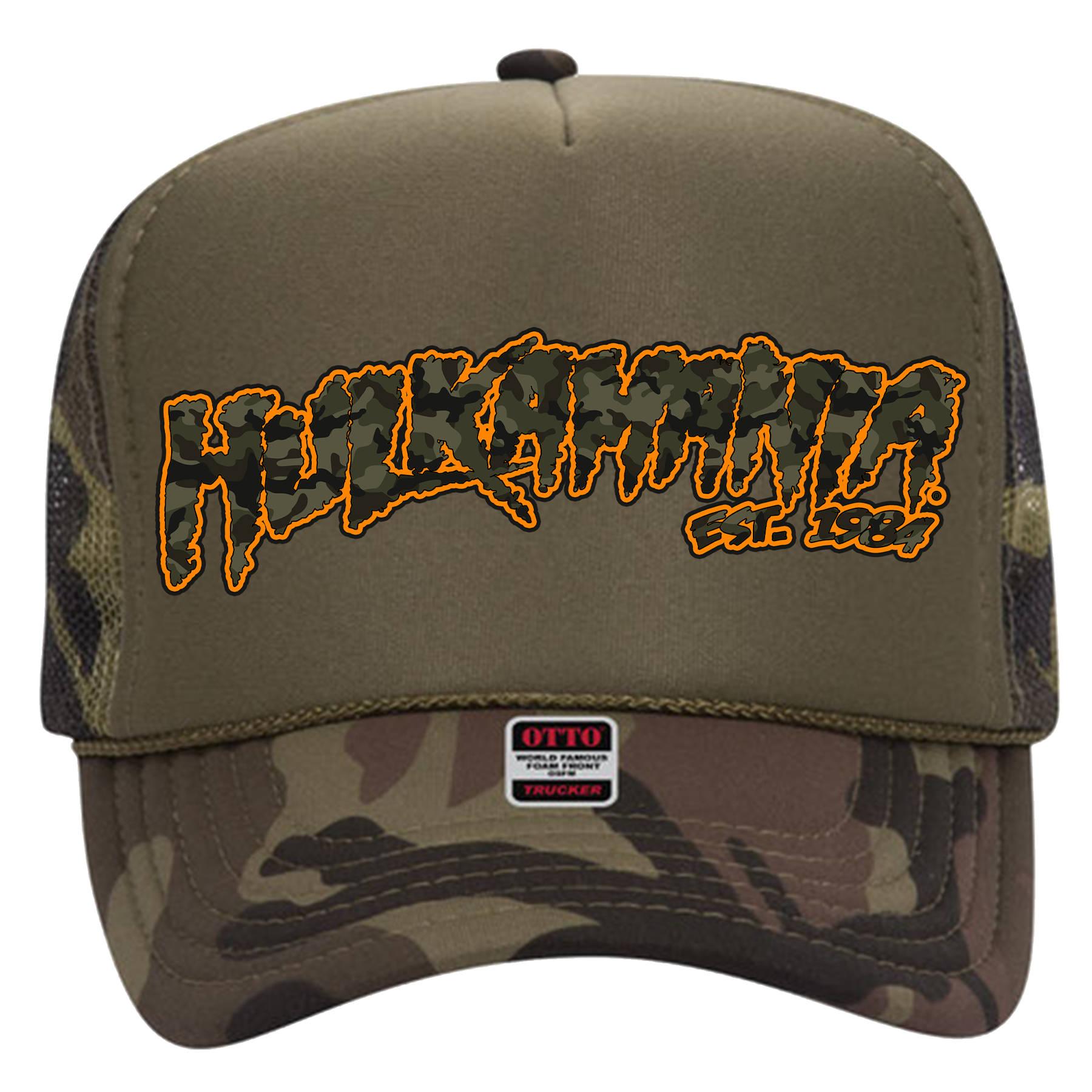 Green Camo/Green Hulkamania Green Camo/Orange Letters Trucker Hat