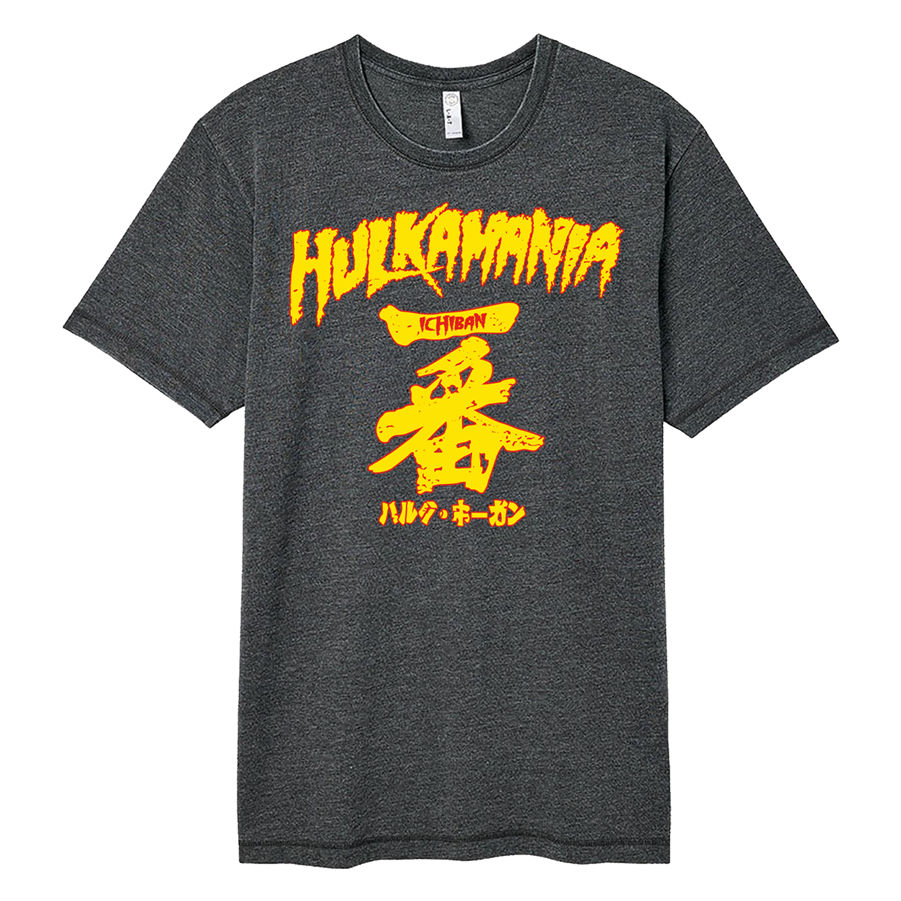 Step into the ring in style with the exclusive Hulkamania "Ichiban" tee! Featuring the iconic "Hulkamania" logo in bold red and yellow with Japanese characters underneath, this tee pays tribute to Hulk Hogan's legendary status in both American and Japanese wrestling.