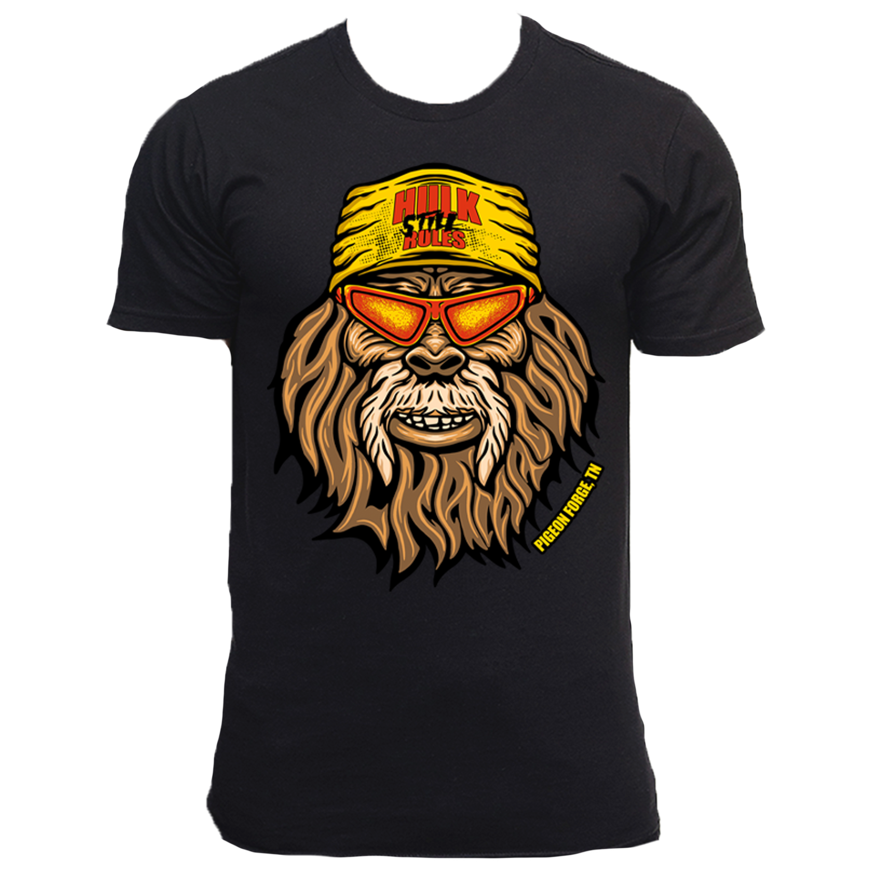 The beard's bigger, the shades are louder, and the legend? Still ruling. This bold black tee features a wild, larger-than-life graphic of the Hulkster looking like a mountain warrior straight out of the Smokies — repping Pigeon Forge, TN with unmistakable swagger.